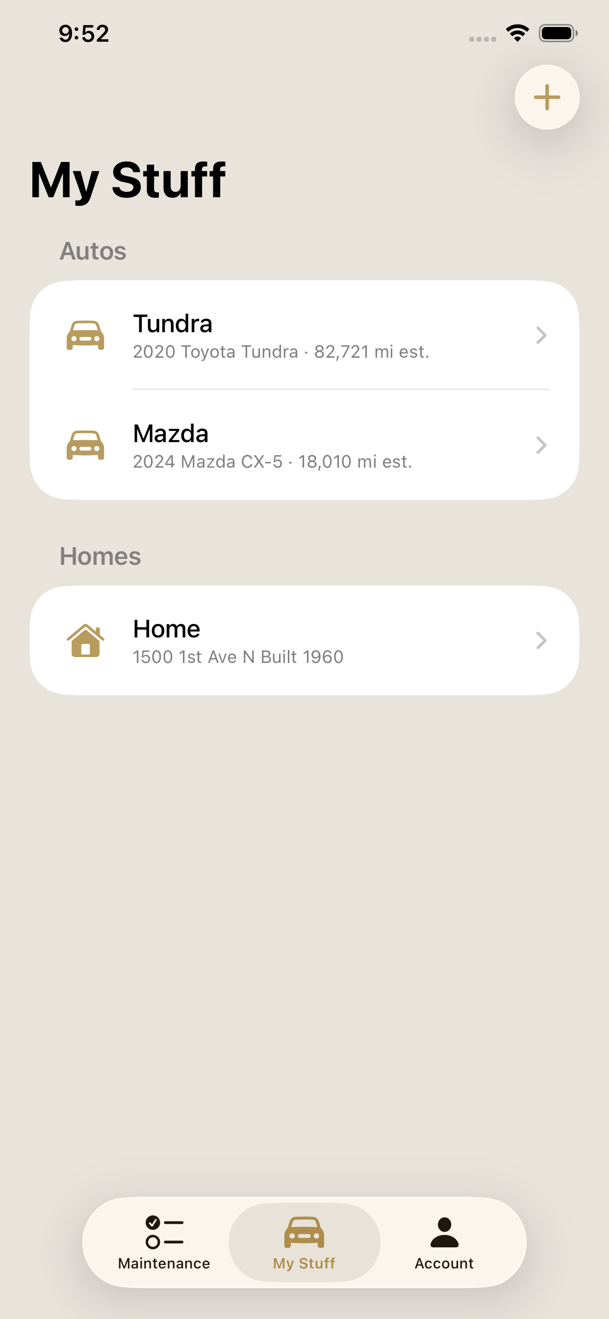 Add your vehicles, homes, and anything else you want to track. Enter year, make, model, and mileage for vehicles. Add your home address, year built, and square footage. Everything in one place, organized and easy to find.